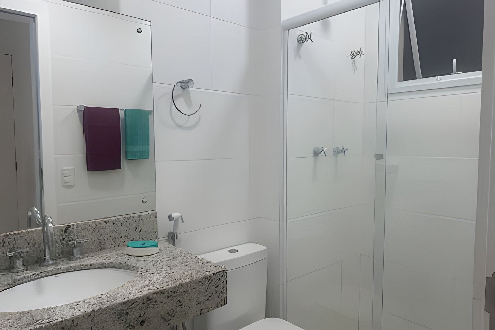 Apartamento de dois quartos, sendo um suite, dois banheiros, sala conjugada com a cozinha, sacada com churrasqueira, aréa de serviço, ar condicionado nos quartos, condomínio com piscina, garagem.
