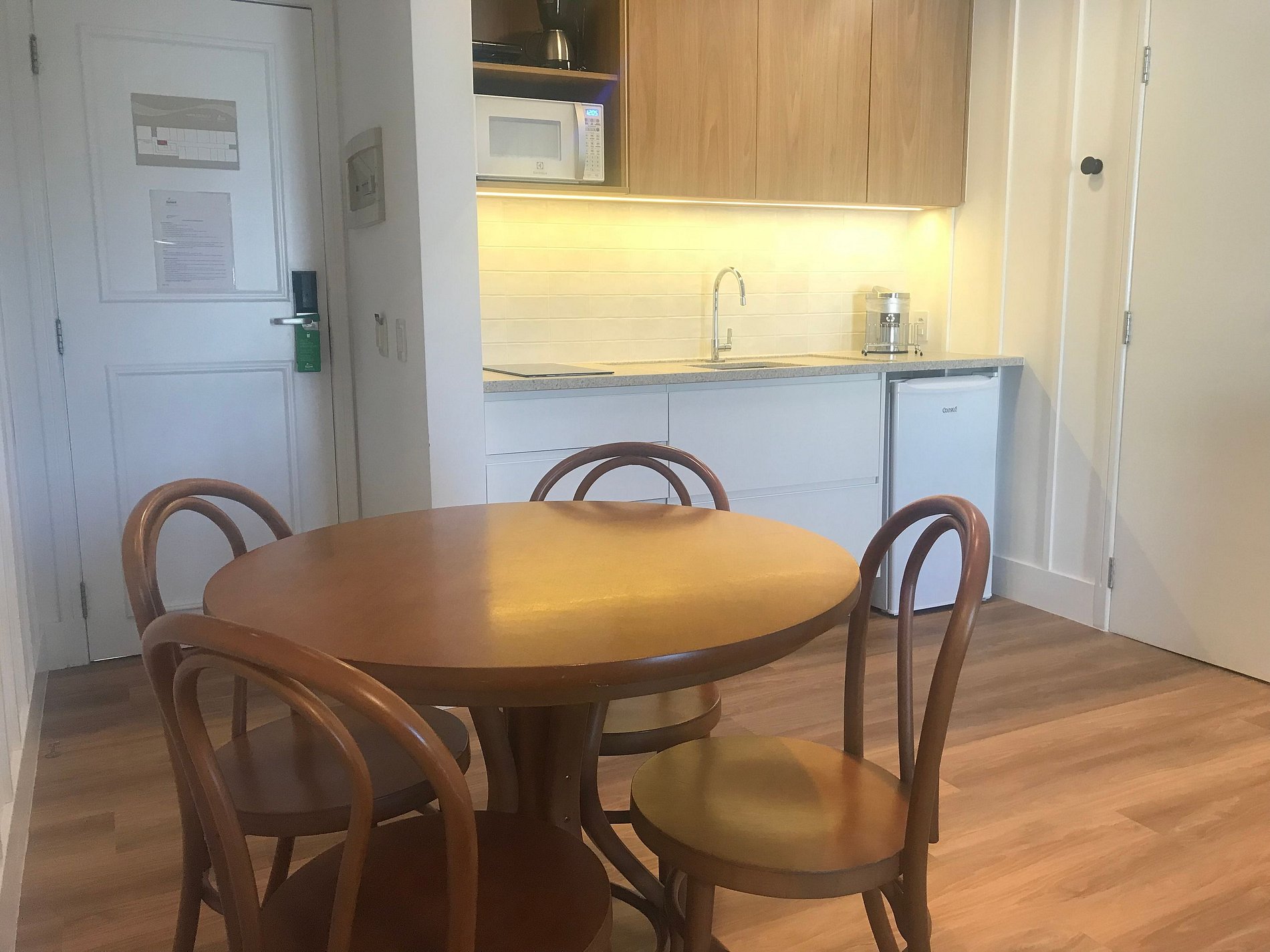 SUITE é equipado com TV a cabo LCD 32, frigobar, microondas, fogão elétrico, utensílios de cozinha, mesa, cadeiras, guarda roupas, ar condicionado, cofre, secador de cabelo e varanda com vista para rua.
