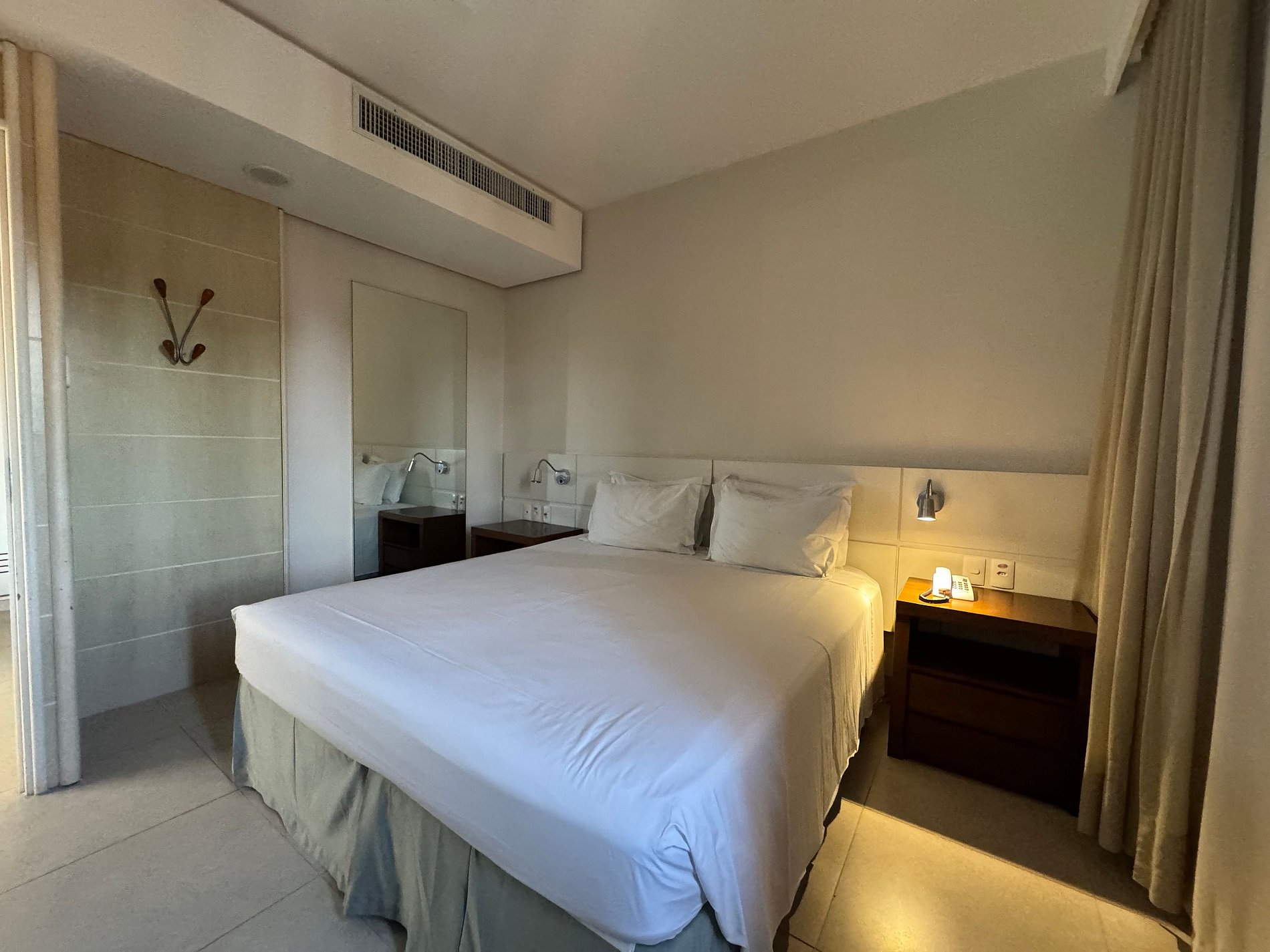 SUITE é equipado com TV a cabo LCD 32, frigobar, microondas, fogão elétrico, utensílios de cozinha, mesa, cadeiras, guarda roupas, ar condicionado, cofre, secador de cabelo e varanda com vista para rua.