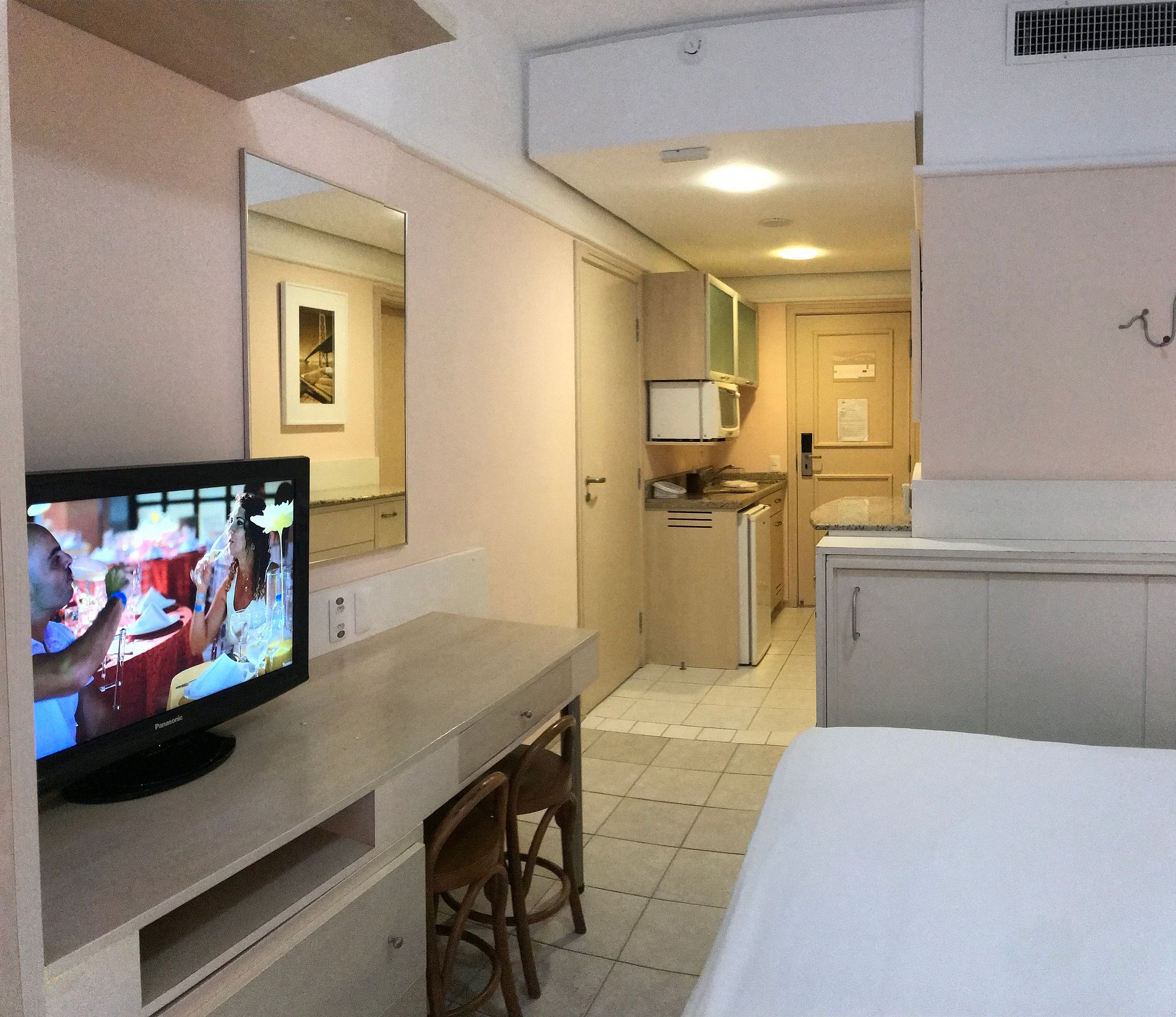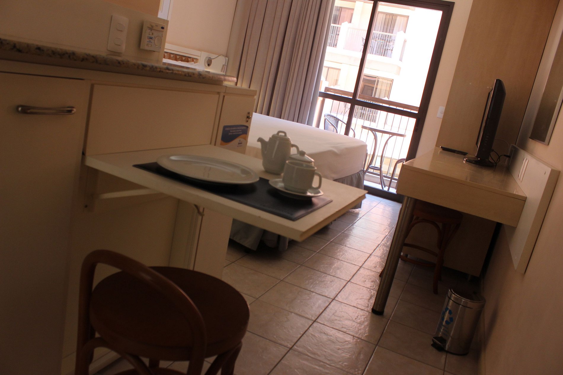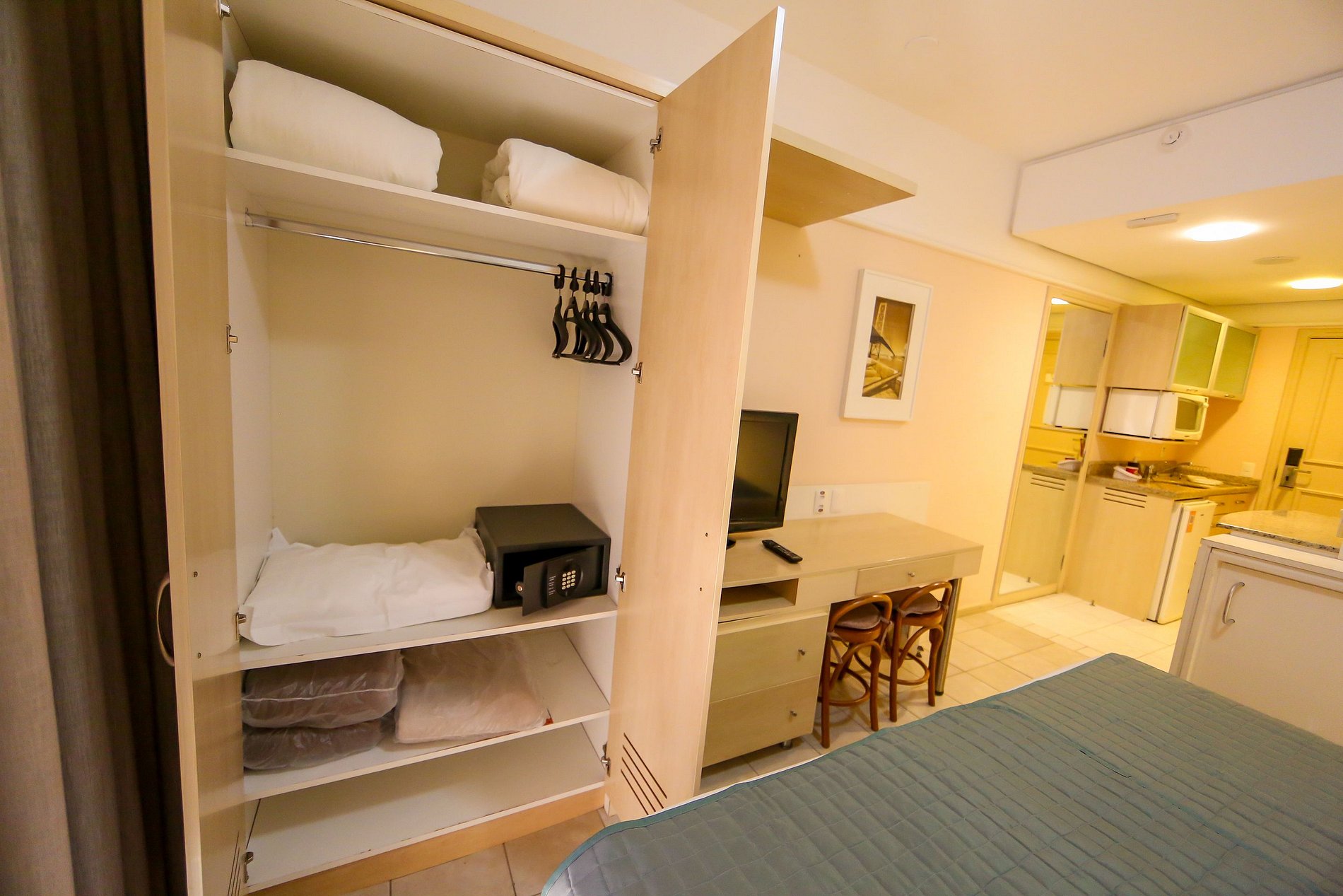 Studio é equipado com TV a cabo LCD 32, frigobar, microondas, utensílios de cozinha, mesa, cadeiras, guarda roupas, ar condicionado, cofre e varanda com vista lateral para o mar.