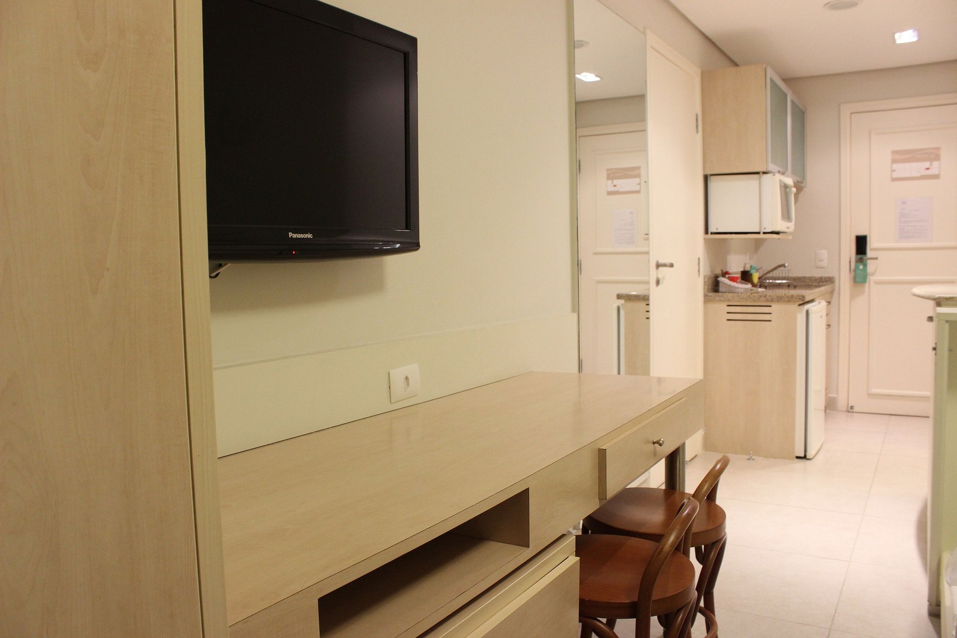 Studio é equipado com TV a cabo LCD 32, frigobar, microondas, utensílios de cozinha, mesa, cadeiras, guarda roupas, ar condicionado, cofre, secador de cabelo e varanda com vista lateral para o mar.