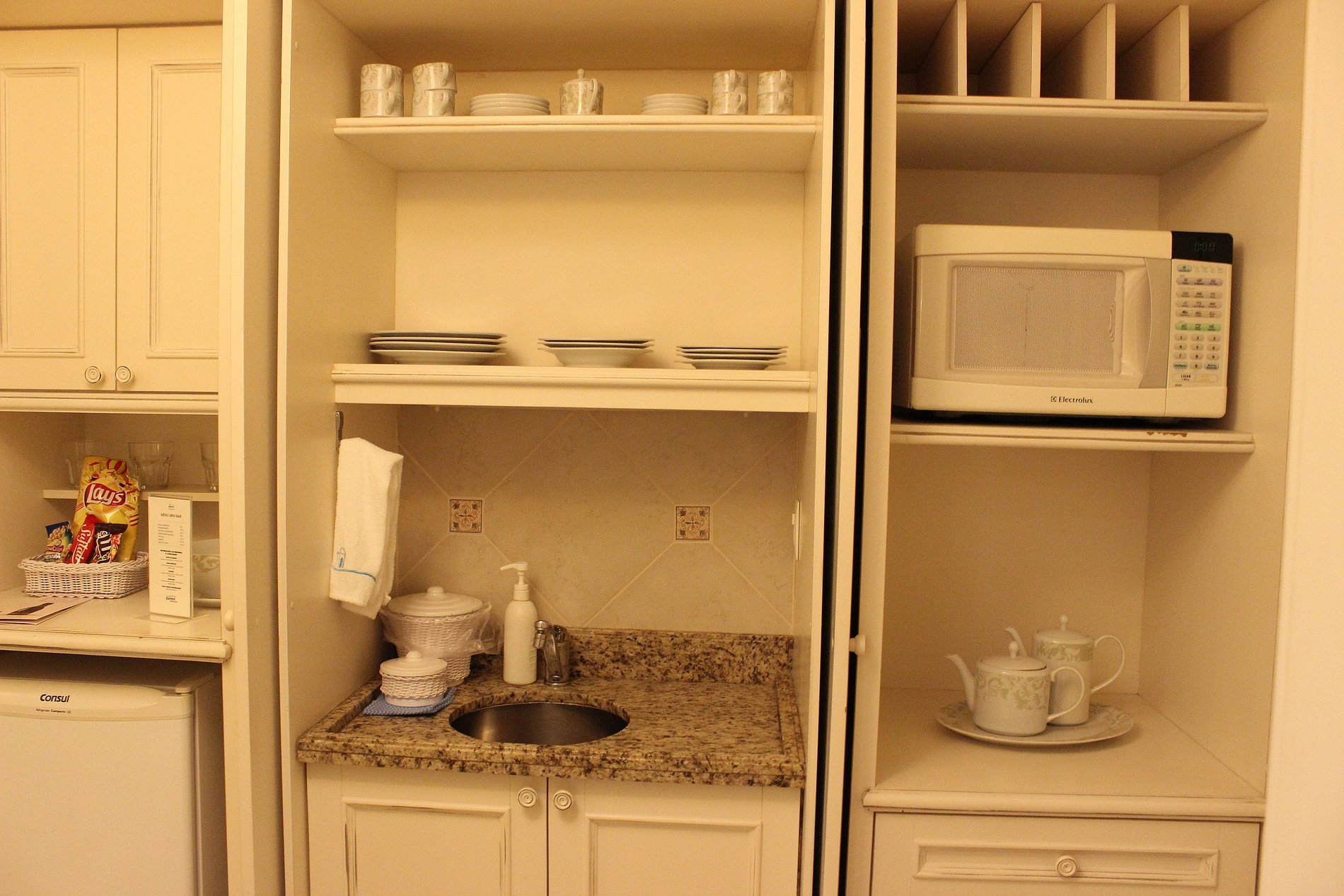 A suíte é equipada com TV a cabo LCD 32 no quarto e na sala, utensílios de cozinha, espaço para refeição, micro-ondas, frigobar, ar condicionado, cofre, banheiro com hidromassagem vertical (8 jatos), secador de cabelo e varanda com vista lateral para o mar.