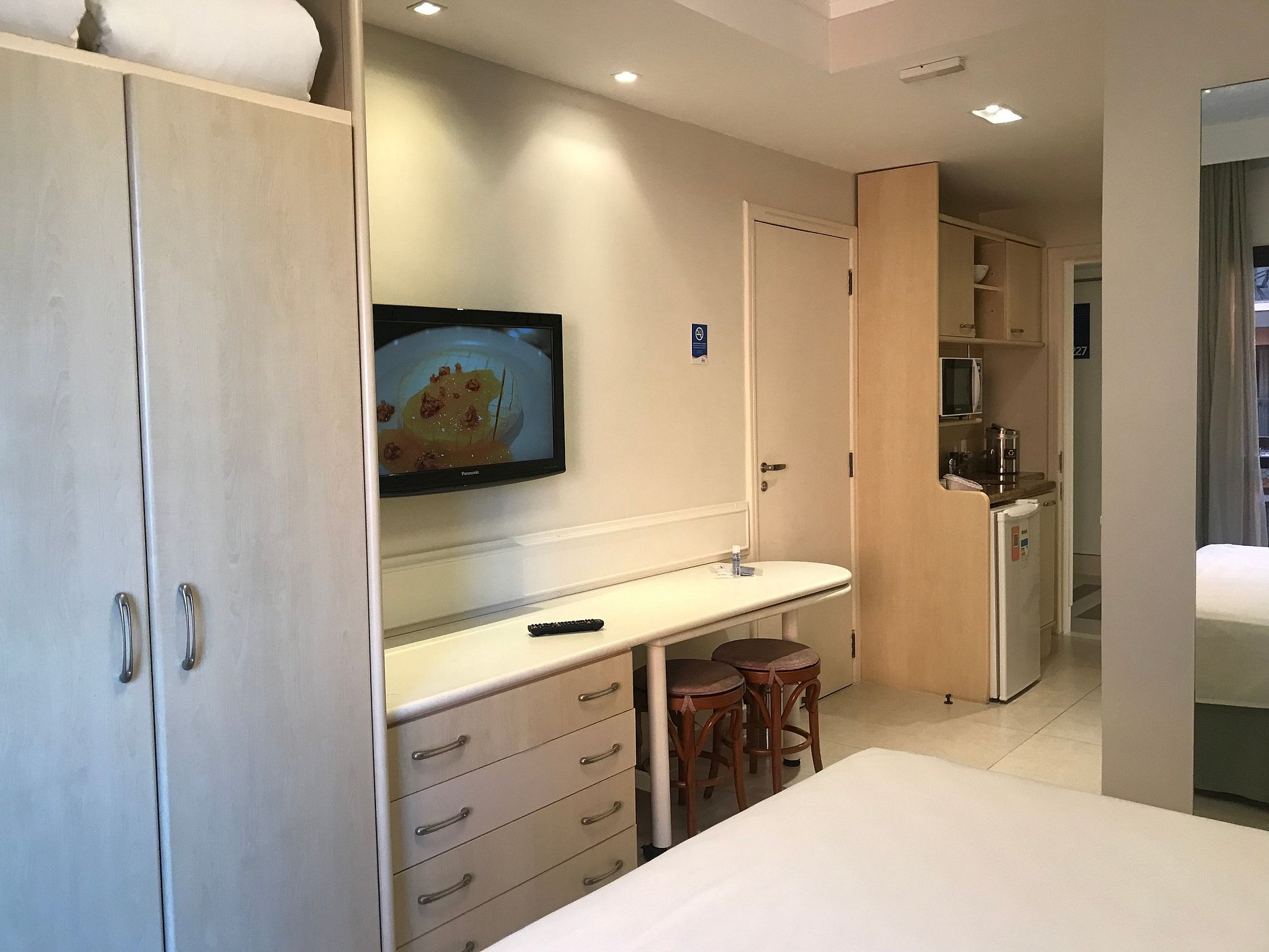 Oferece completa estrutura, com localização à beira mar (pé na areia), piscina aquecida, jacuzzi, serviço de praia, serviço diário de arrumação por camareira e amenities para banho: sabonete, shampoo e concicionador, sauna, academia, espaço Kids com recreacionista, sala de jogos, restaurante e bar (custo à parte). Café da manhã é opcional, não está incluído no valor.Apartamento reformado de 27m² com sacada, vista lateral mar; 2 camas solteiro, unidas formam cama casal; 1 cama extra embutida na parede, dimensão menor a cama solteiro; Mini cozinha com frigobar Micro-ondas utensílios de cozinha; TV a cabo LCD 32, frigobar, microondas, utensílios de cozinha, mesa, cadeiras, guarda roupas, ar condicionado, cofre, secador de cabelo.