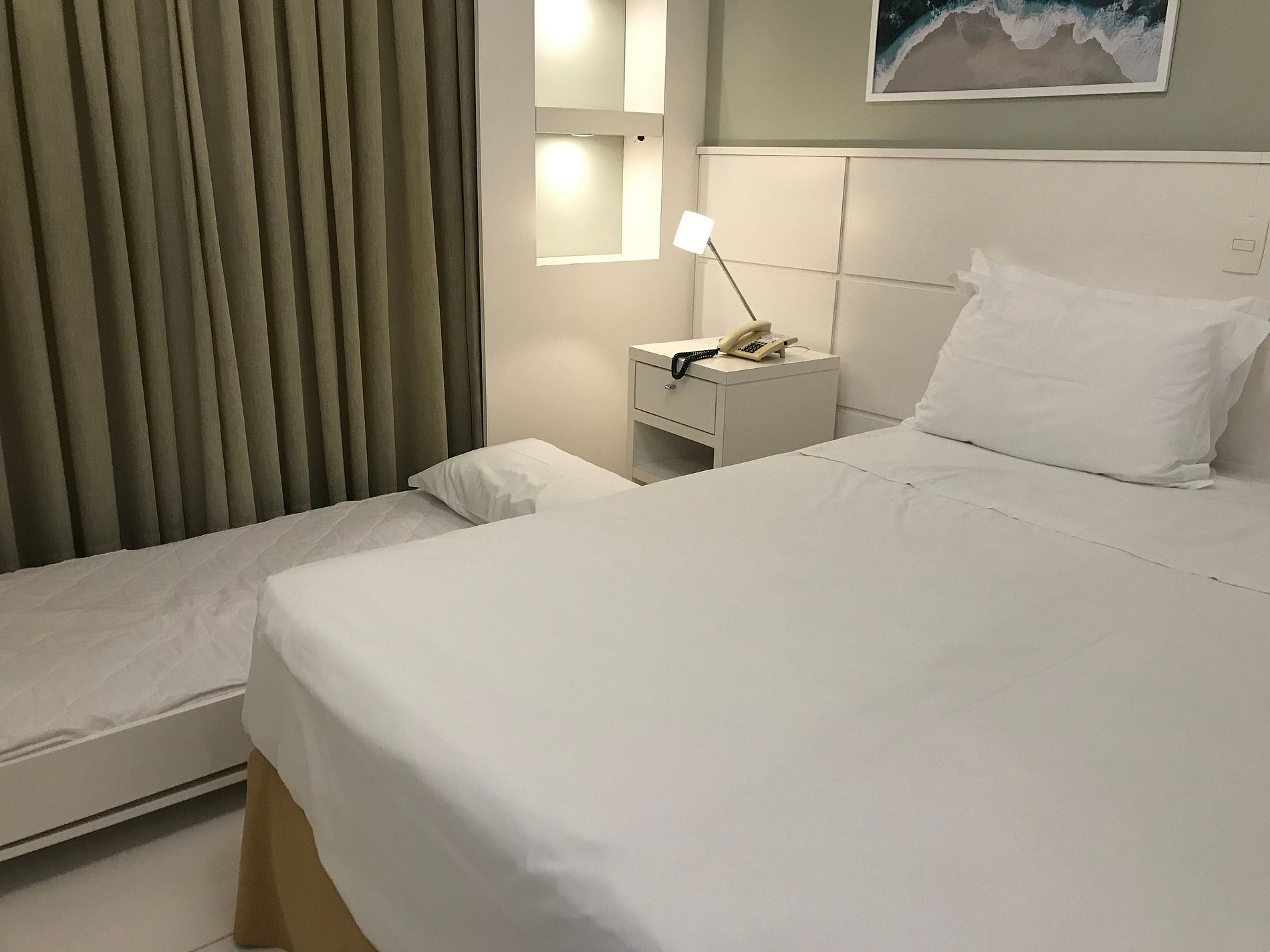 Apartamento diferenciado de 27m² com sacada, vista plena para o mar; 2 camas solteiro, unidas formam cama casal; 1 cama extra embutida , dimensão menor a cama solteiro; Mini cozinha com frigobar Micro-ondas utensílios de cozinha; TV a cabo LCD 32, frigobar, microondas, utensílios de cozinha, mesa, cadeiras, guarda roupas, ar condicionado, cofre, secador de cabelo.