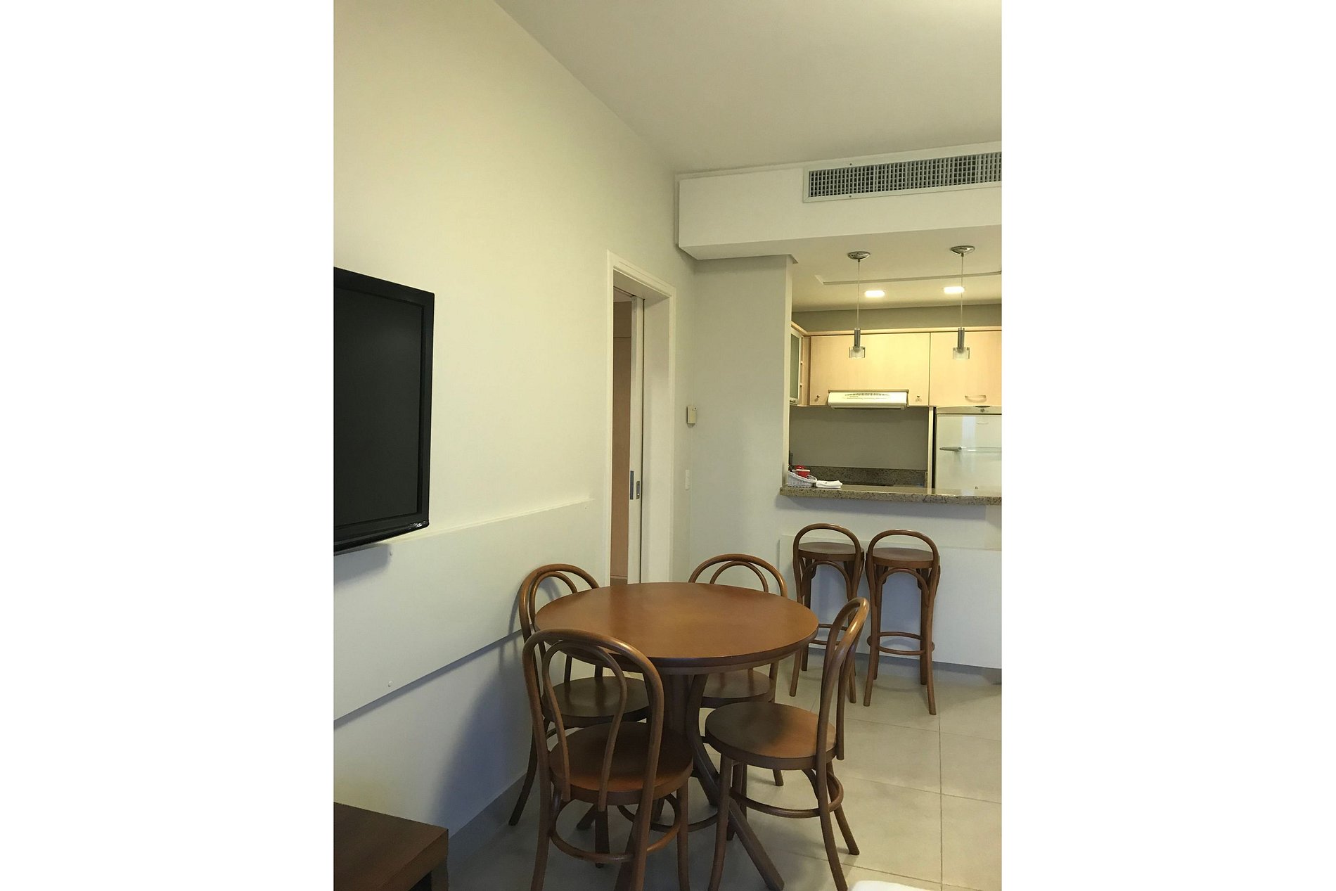 Sala com Mesa de jantar; TV a cabo tela LCD 42”, sofá cama de casal (menor que cama casal), uma cama extra de solteiro, que quando não esta sendo utilizada fica embutida (menor que cama solteiro).