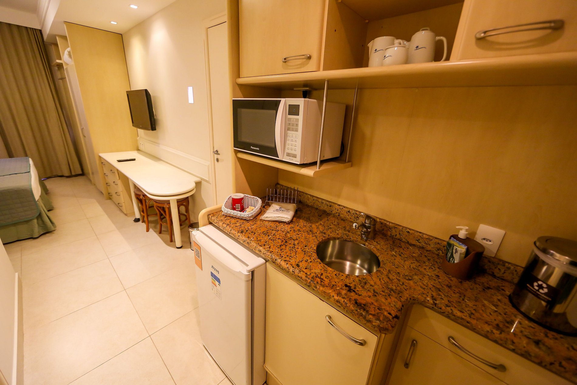 Apartamento reformado de 27m² com sacada, vista lateral mar; 2 camas solteiro, unidas formam cama casal; 1 cama extra embutida na parede, dimensão menor a cama solteiro; Mini cozinha com frigobar Micro-ondas utensílios de cozinha; TV a cabo LCD 32, frigobar, microondas, utensílios de cozinha, mesa, cadeiras, guarda roupas, ar condicionado, cofre, secador de cabelo.
