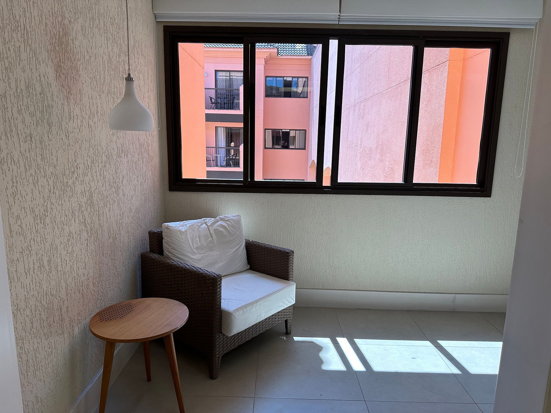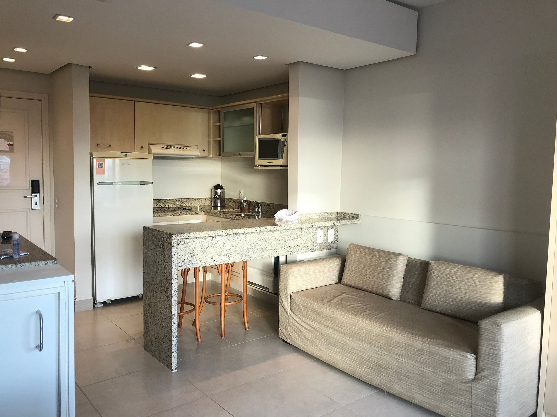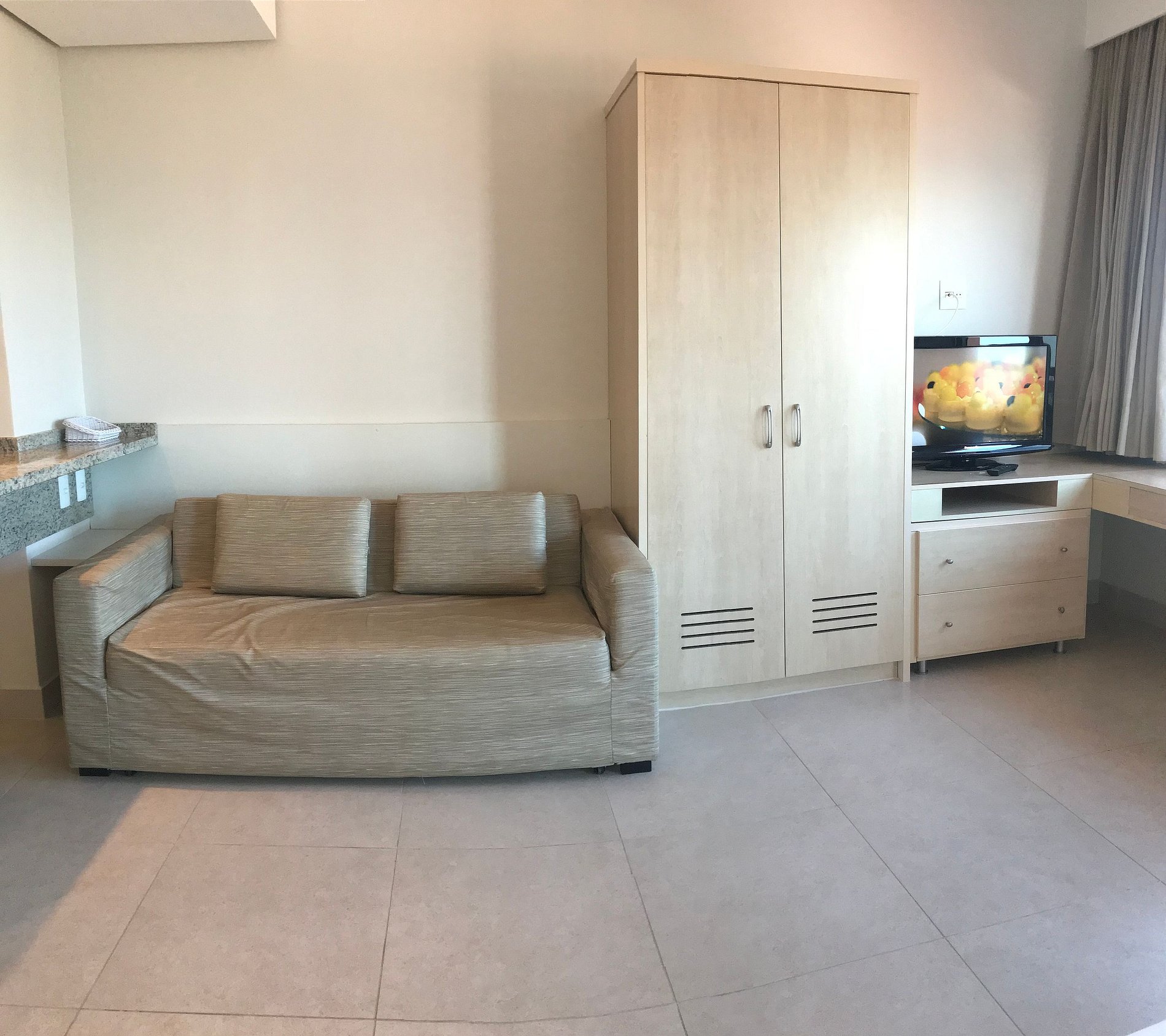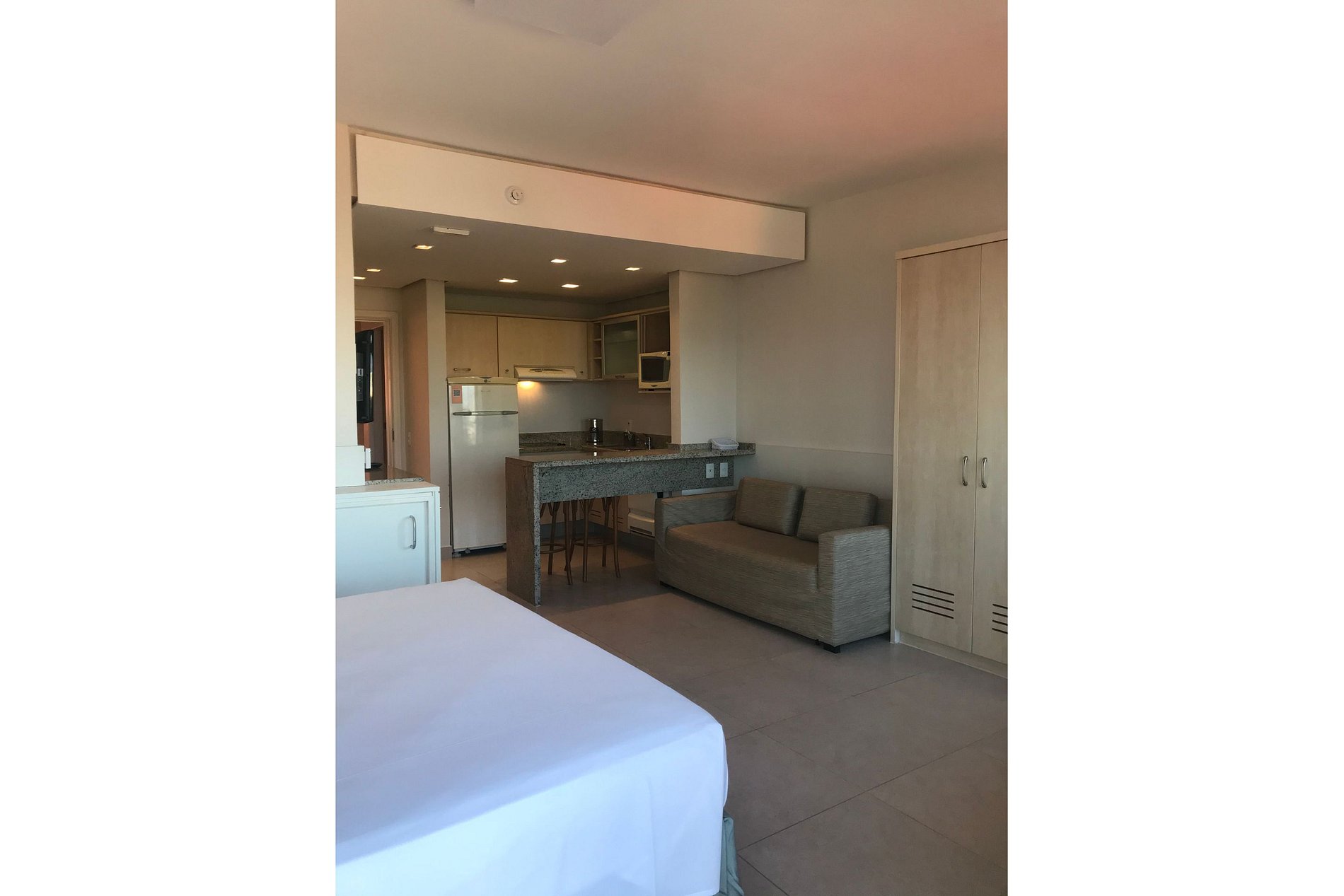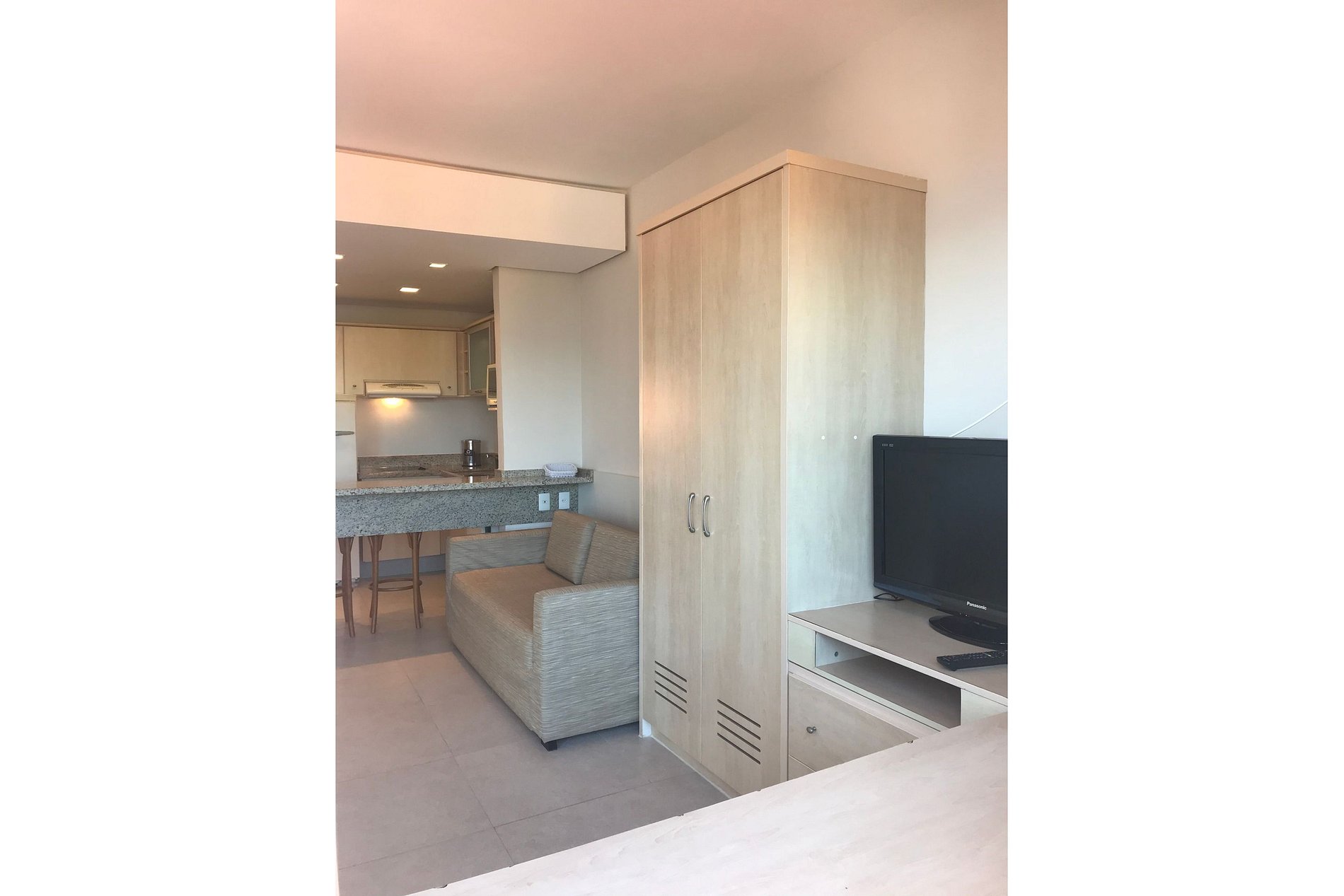 Apartamento com vista lateral, 39 m2, ar condicionado, sofá cama casal, cama extra de solteiro (embutida), cama de casal ou duas de solteiro, TV a cabo tela LCD 32”. Cozinha completa: geladeira, micro-ondas, fogão elétrico, pia, louças, talheres e panelas.