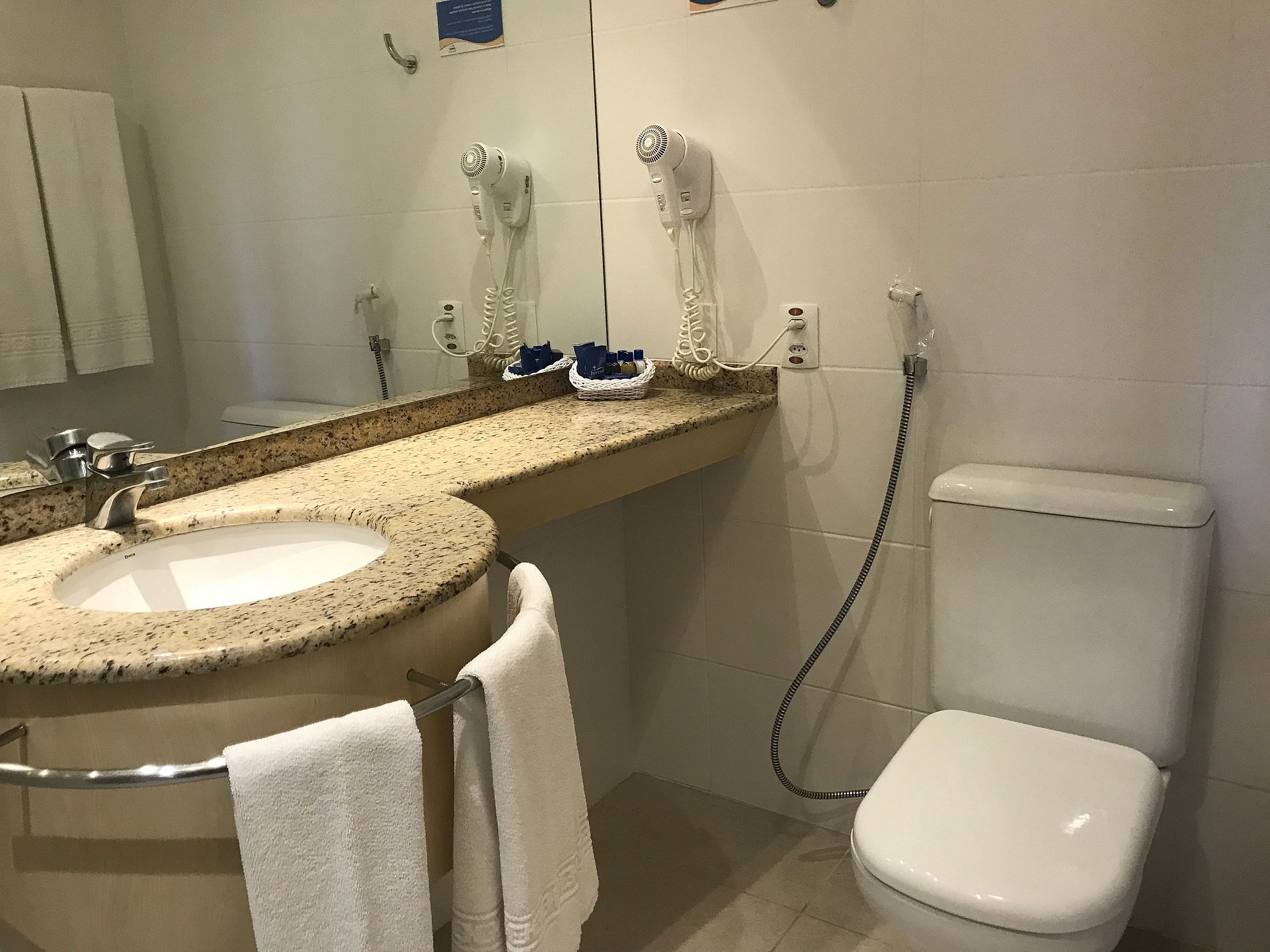 Banheiro com secador de cabelos; shampoo, condicionador e sabonete.