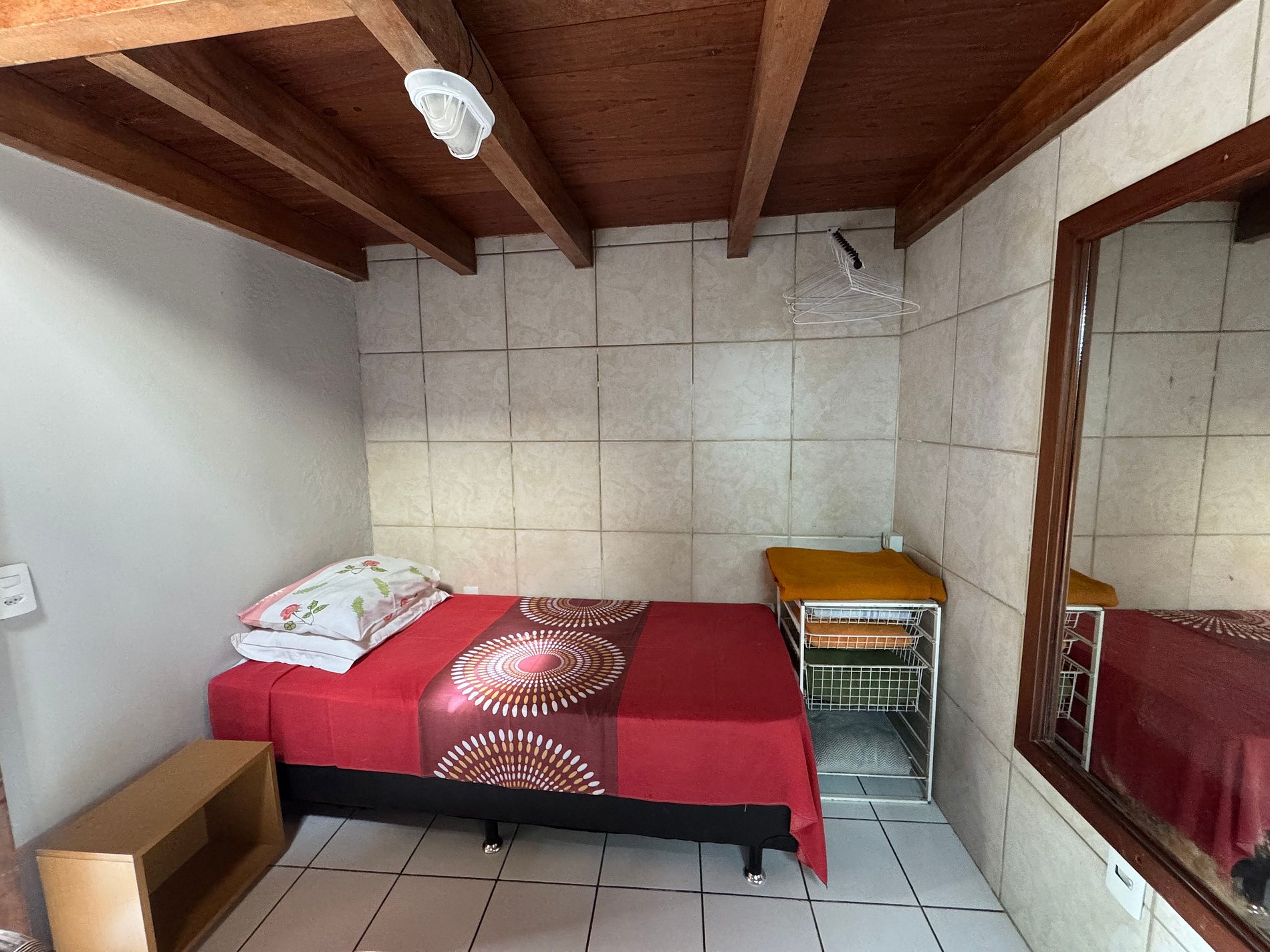 Casa com um dormitório, cama de casal, TV, ar condicionado, cabideiro, na sala cama box, mesa, 3 bancos, cozinha separada e completa com geladeira, fogão 2 bocas a gás, pia, utensílios de copa/cozinha. Banheiro com chuveiro elétrico.
