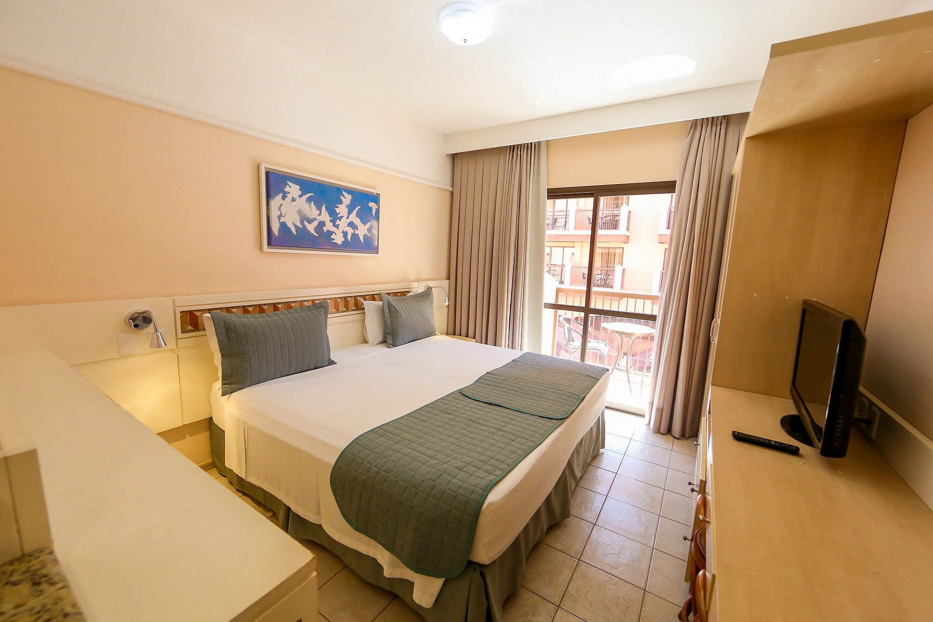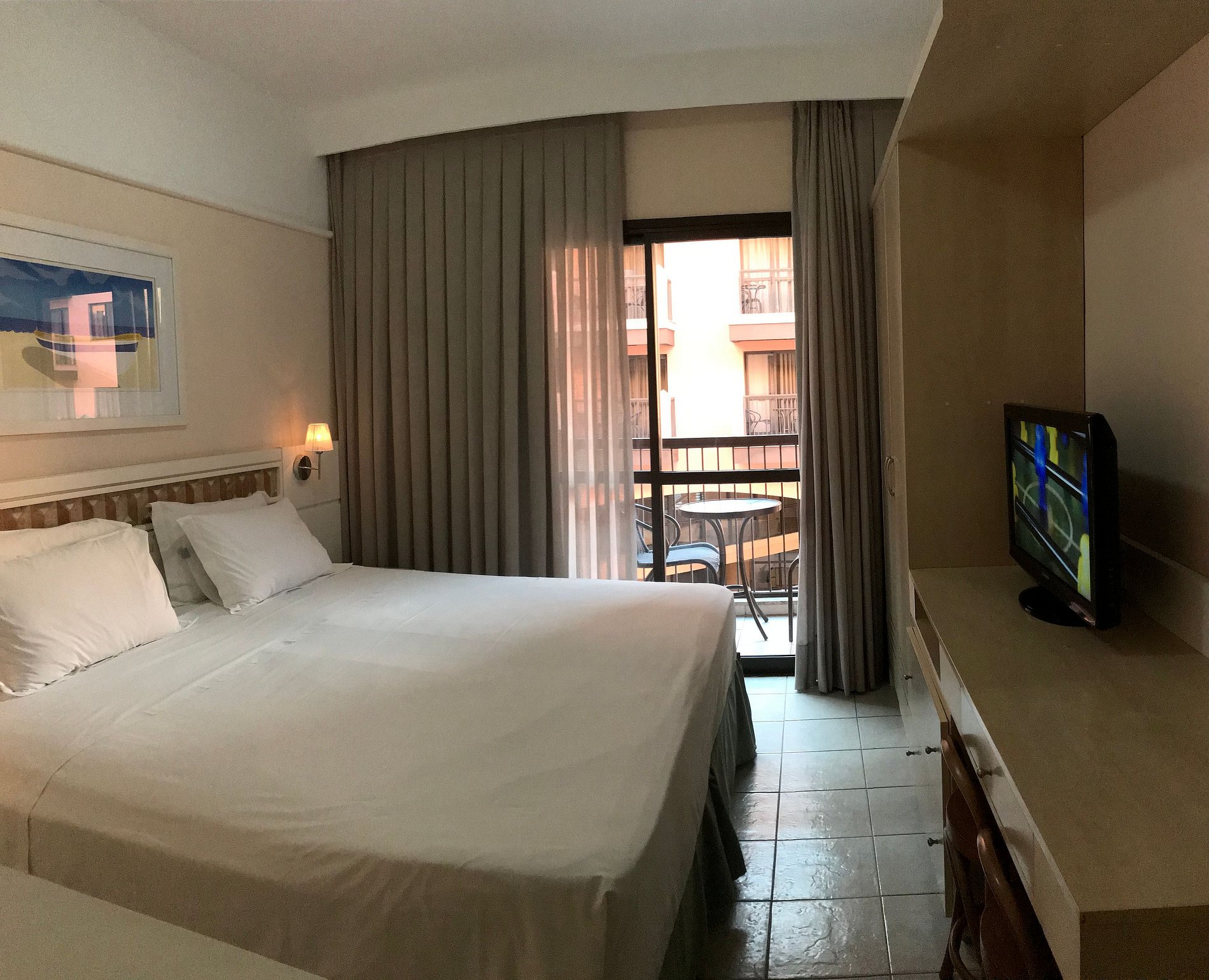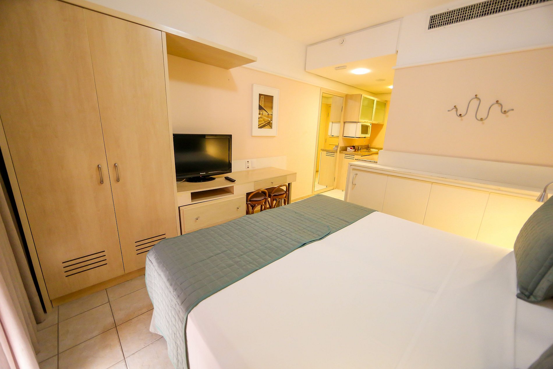Studio é equipado com TV a cabo LCD 32, frigobar, microondas, utensílios de cozinha, mesa, cadeiras, guarda roupas, ar condicionado, cofre e varanda com vista lateral para o mar.