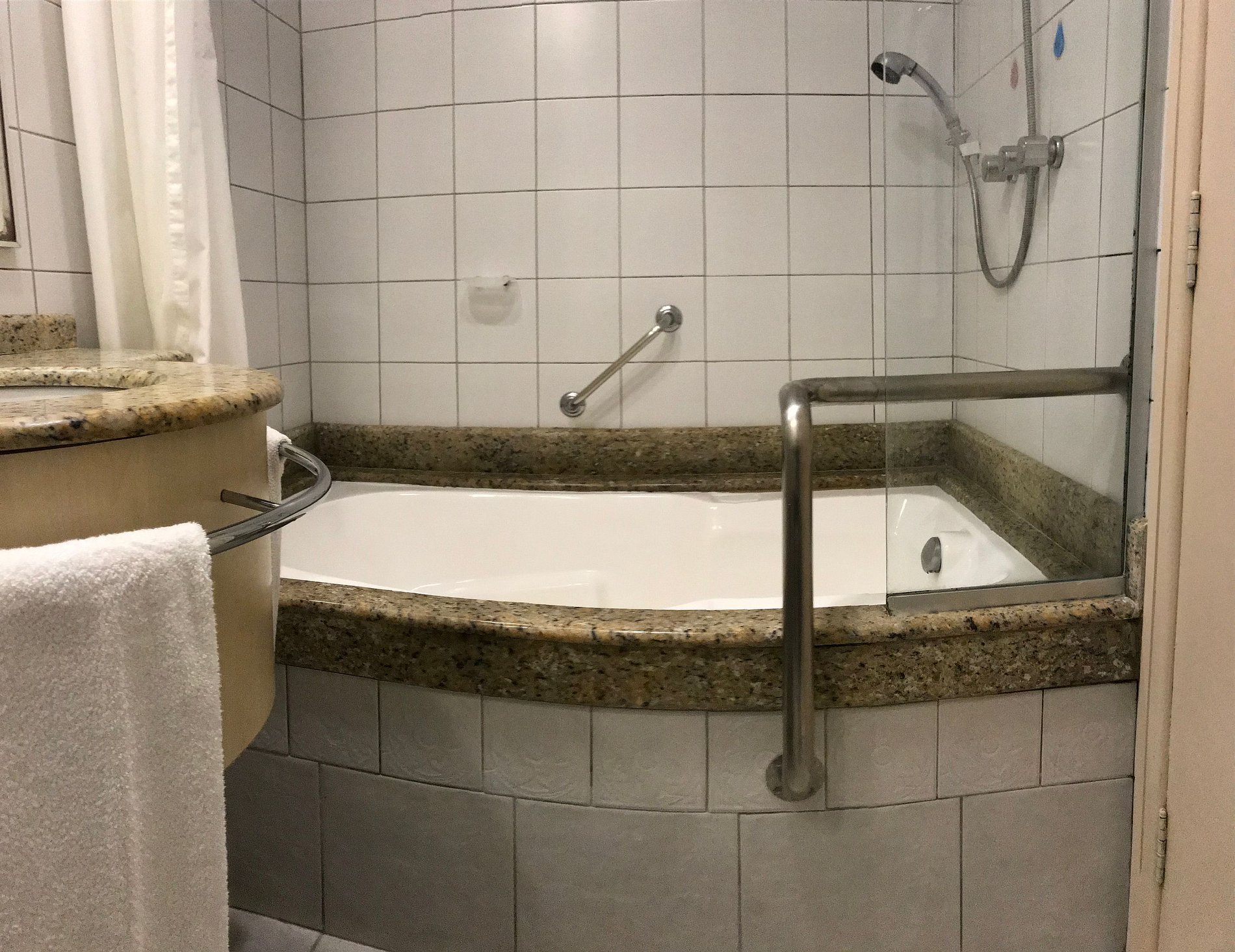 Banheiro com banheira, secador e amenities.