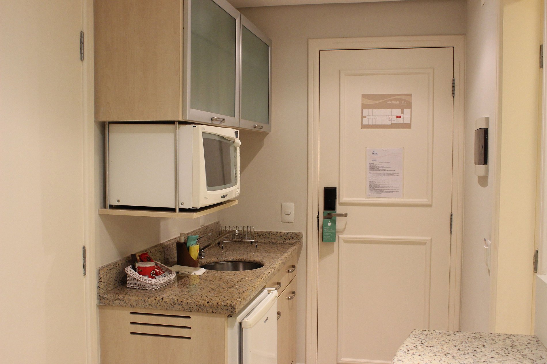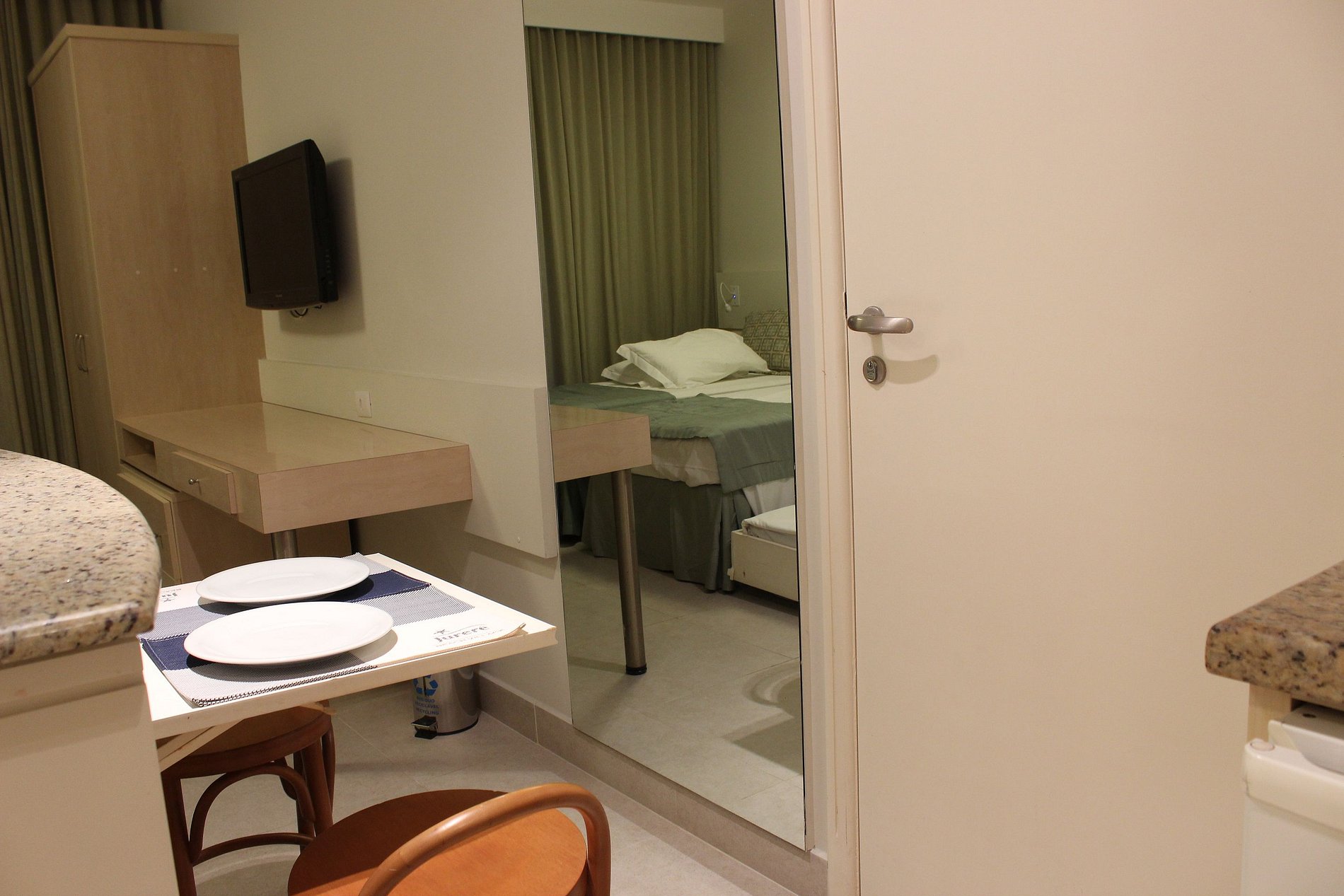 Studio é equipado com TV a cabo LCD 32, frigobar, microondas, utensílios de cozinha, mesa, cadeiras, guarda roupas, ar condicionado, cofre, secador de cabelo e varanda com vista lateral para o mar.