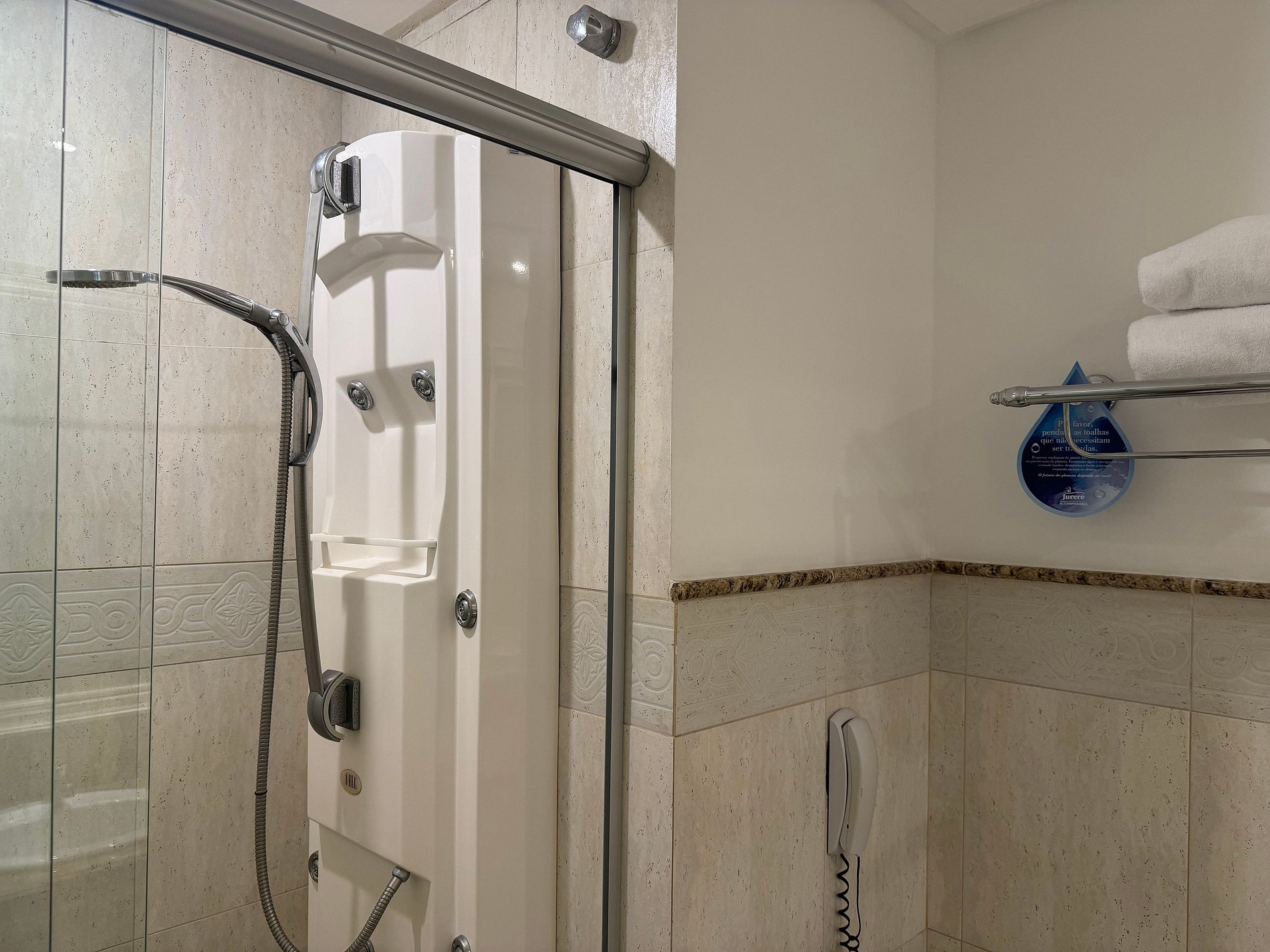A suíte é equipada com TV a cabo LCD 32 no quarto e na sala, utensílios de cozinha, espaço para refeição, micro-ondas, frigobar, ar condicionado, cofre, banheiro com hidromassagem vertical (8 jatos), secador de cabelo e varanda com vista lateral para o mar.